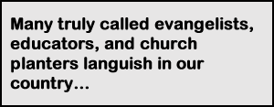 While many national people believe that ALL AMERICANS are rich and should be obligated to support them, the truth is not convincing to many nationals. Try explaining, “Yes, America is rich but most of the money is not in the Christian’s pocket” or “I would be rich if I could use my income in your standard of living, try using your income in my standard of living”. Many, if not most, donations come from sacrificial giving by believers who love the Lord and want to obey His command to reach their world; asking them to give to reach those they will never meet, in places they will never go. Dedicating a tithe or more from general giving is ok to most, but then there are those churches who promote faith-promise giving, asking their members to dig deeper into their pockets.