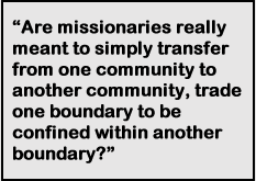 This example of missionary zeal should challenge missionaries of today. We follow Paul through his journeys and find him spending hours in some places, days in others, weeks, months and sometimes years in multiple communities. Here then is the question, “Are missionaries really meant to simply transfer from one community to another community, trade one boundary to be confined within another boundary?”